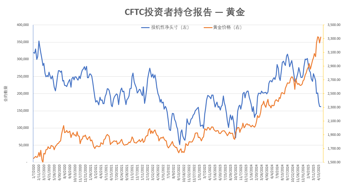 其实金价在过去三周已经从单边上行走势转为高位震荡,且始终高出200天均线25%以上,这通常意味着均值回顾的临近?;平鸬耐痘远嗤吠反纾ㄏ峦祭断撸┥踔猎诟绲氖焙蚓鸵丫⒊鼍?,在过去7周中有6周下降,形成了2020年以来与金价(黄线)最大程度的背离。在本周跌破3200美元后,黄金形成了标准的双顶结构,暗示金价的调整或将延续。只是我们无法得知这将会是一个跨度多长的调整周期。